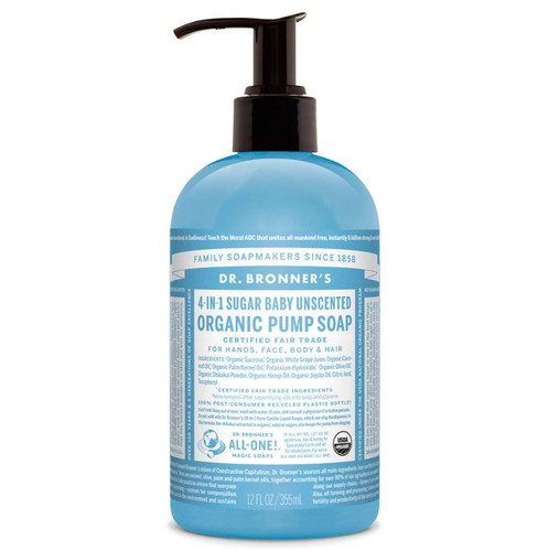 Dr Bronner's Organic Baby Pump Soap 355ml provides an extra-gentle yet effective cleanse for babies, sensitive skin, and the whole family. Made with fair trade organic sugar and organic white grape juice, this mild formula helps nourish and hydrate skin while maintaining its natural balance. A blend of organic coconut, olive, and hemp oils creates a soft, creamy Castile lather that cleanses without stripping moisture.