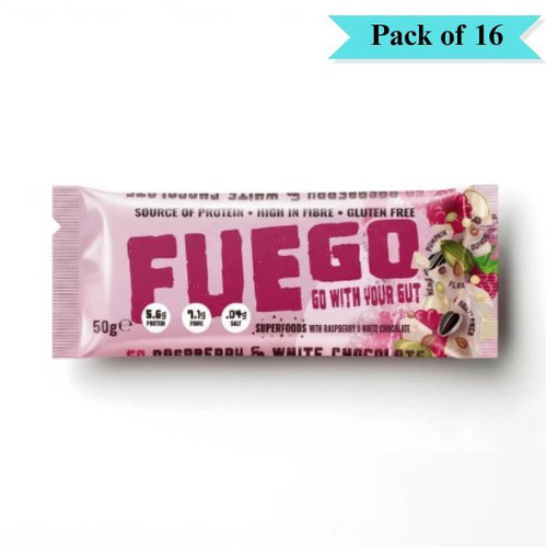 Fuego Go With Your Gut Raspberry & White Choc Superfood Fibre Bar - Pack of 16 (50g each)