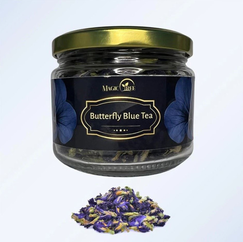Magictree Superfoods Butterfly Blue Tea is a vibrant loose flower tea made from naturally grown Butterfly Blue Tea flowers sourced from Nepal. Known for its striking blue colour, this tea offers a visually captivating and refreshing drinking experience.