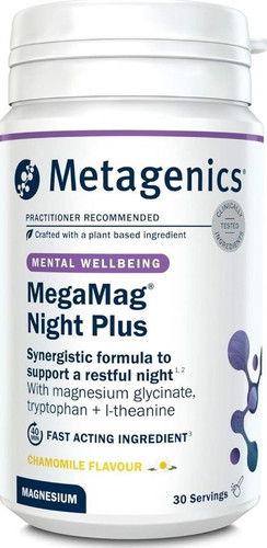 MegaMag Night Plus is a fast-acting magnesium powder designed to support restful sleep and overall relaxation. It combines 200mg of highly absorbable magnesium (as magnesium glycinate) with sleep-supporting ingredients including L-tryptophan, hops extract, Lactium (milk protein hydrolysate), L-theanine, and body-ready forms of folic acid (5-methyl tetrahydrofolate) and vitamin B12 (methylcobalamin). This therapeutic powdered formula allows for higher and more effective doses than tablets or capsules, making it ideal for those who struggle with sleep or poor sleep quality.