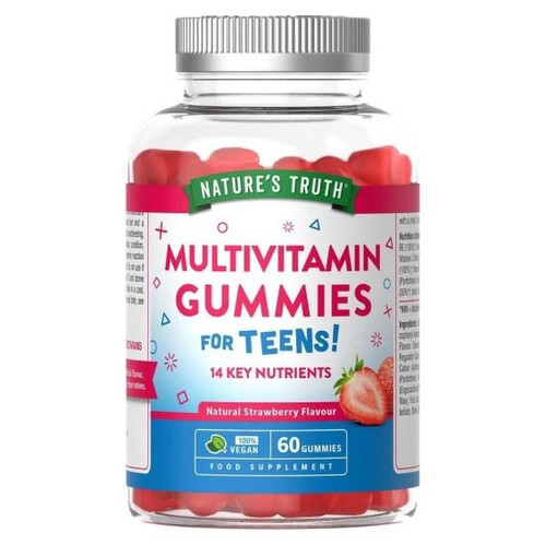 Support growing bodies with Nature's Truth Teens Multivitamin Gummies. These strawberry-flavoured vegan gummies deliver a broad spectrum of essential vitamins and minerals tailored to teenage nutritional needs.