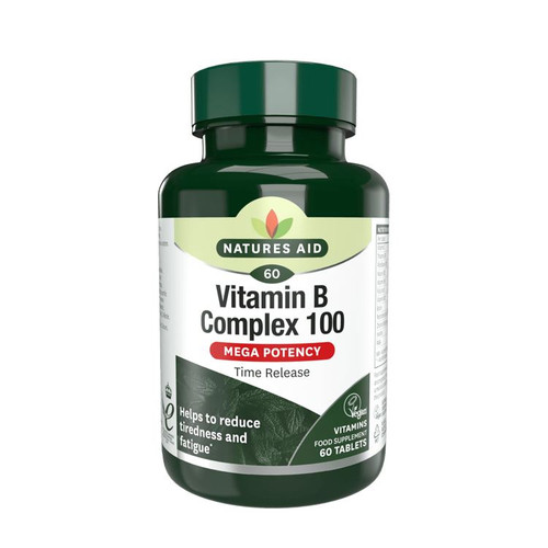 Experience the benefits of Natures Aid Vitamin B Complex 100, a mega potency, time-release formula designed to support energy production and the normal functioning of the nervous system. This comprehensive complex provides essential B vitamins to help reduce tiredness and fatigue, promoting overall vitality and wellbeing.