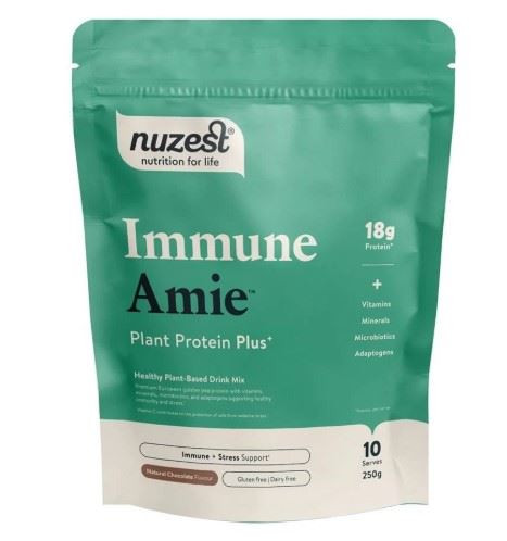 Immune Amie is a chocolate-flavoured plant-based protein drink mix designed to support immune health and the body’s natural stress response. It combines premium European golden pea protein with berries, functional mushrooms, microbiotics, and adaptogens for daily nutritional support.