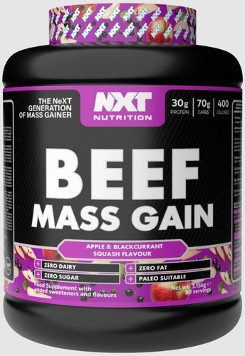 NXT Nutrition Beef Mass Gain is an advanced weight gain formula designed to support lean muscle growth and recovery. It combines high-quality beef protein with fast-digesting carbohydrates to help increase daily calorie intake without relying on heavy dairy-based gainers.