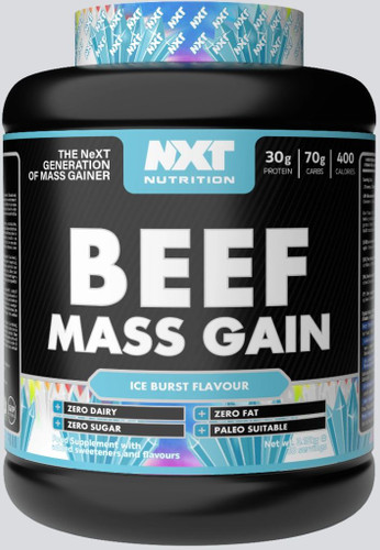 NXT Nutrition Beef Mass Gain Ice Blast is a premium weight gain formula designed for serious athletes and fitness enthusiasts. Packed with 30g of high-quality beef protein per serving and rapidly absorbable carbohydrates, it supports muscle growth, recovery, and energy replenishment. This clean formula is perfect for those looking to boost their calorie intake without unnecessary sugar or fat.