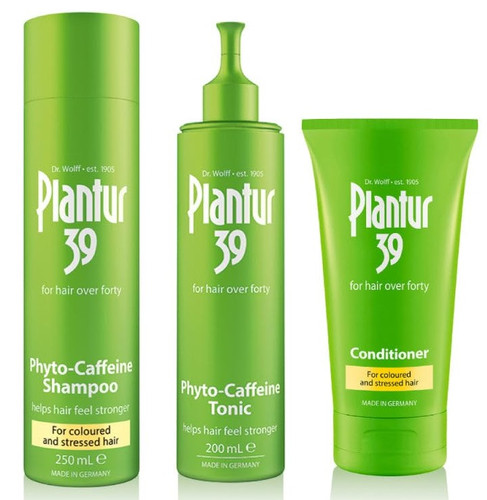 Plantur 39 Caffeine Tonic, Shampoo, and Conditioner For Colour-Treated & Stressed Hair. Caffeine-enriched is designed to prevent the exhaustion of hair production during and after menopause. Natural wheat extracts and provitamin B5 condition and repair the hair. The damaged hair structure is smoothed and the hair is provided with intensive shine. Active ingredients protect within the first 2 minutes of hair washing for 24 hours.