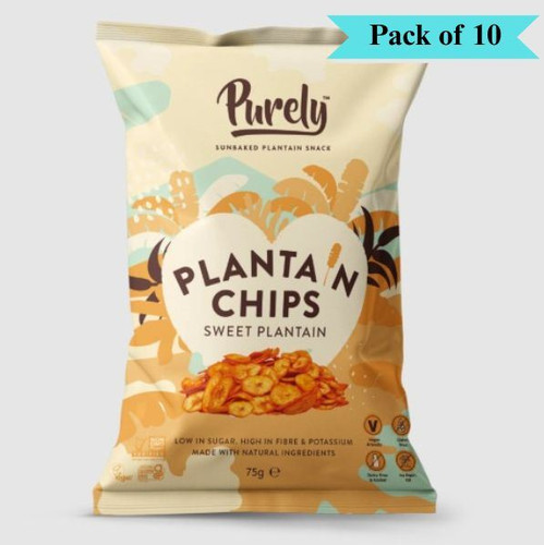 Purely Plantain Chips Sweet Plantain are a simple, wholesome snack made from just two natural ingredients: carefully selected plantains and sunflower oil. These chips offer a naturally sweet, crunchy treat perfect for mindful snacking.