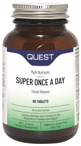 Quest Super Once A Day is an everyday supplement to support optimal well-being. It contains nutrients that contribute to the reduction of tiredness and fatigue. including Folic Acid, Iron, Magnesium, Niacin (B3), Pantothenic acid, Riboflavin (B2), Vitamin B12, Vitamin B6, and Vitamin C. This is a high potency “all-in-one” formula, providing 17 vitamin and vitamin-related ingredients, 12 minerals, and 12 additional factors to augment dietary intake where needed. The minerals are chelated to a blend of amino acids to maximise absorption. Contains a gentle form of ‘iron’ which is less likely to cause constipation or digestive discomfort. This patented timed-release tablet is designed to release nutrients over 6 hours and optimise absorption of water-soluble vitamins.