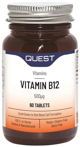 Quest Vitamin B12 500mcg tablets provide a potent and convenient source of Vitamin B12, essential for overall health and vitality. Each tablet is formulated to support energy metabolism, red blood cell formation, and nervous system function.