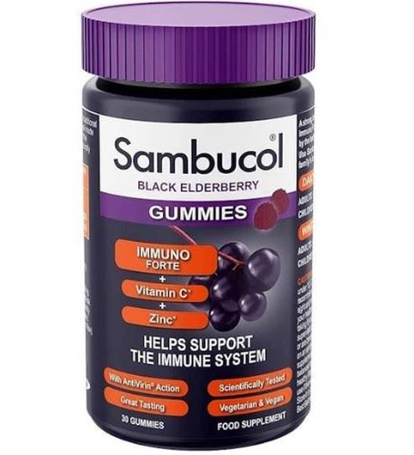 Sambucol Immuno Forte 30 Black Elderberry Gummies combine the natural power of Black Elderberry extract with Vitamin C and Zinc to support the immune system year-round. Free from artificial colours and suitable for vegetarians and vegans, these delicious, non-drowsy gummies are easy to chew and swallow, making immune support simple and enjoyable.