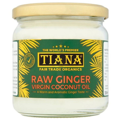 TIANA Fair Trade Organics Raw Virgin Coconut Oil with Ginger combines the creamy richness of coconut oil with a warm, aromatic ginger note. This naturally infused oil adds depth and gentle spice to a wide range of recipes.