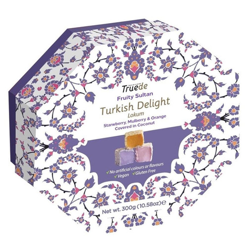 Savour the rich and exotic flavours of Fruity Sultan Delight, a traditional Turkish confection infused with strawberry, mulberry, and orange. Each soft, chewy piece delivers a burst of fruity sweetness balanced with a satisfying texture.