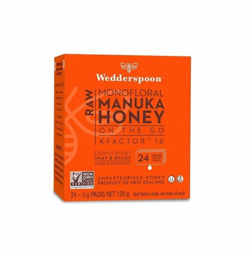 Enjoy the natural goodness of Wedderspoon 100% Raw Manuka Honey on the Go. This convenient pack contains 24 individually sealed sachets, each delivering KFactor 16+ raw Manuka Honey in a portable 120g format. Perfect for travel, office, or outdoor activities, these sachets let you enjoy pure, unpasteurized Manuka Honey anytime, anywhere.